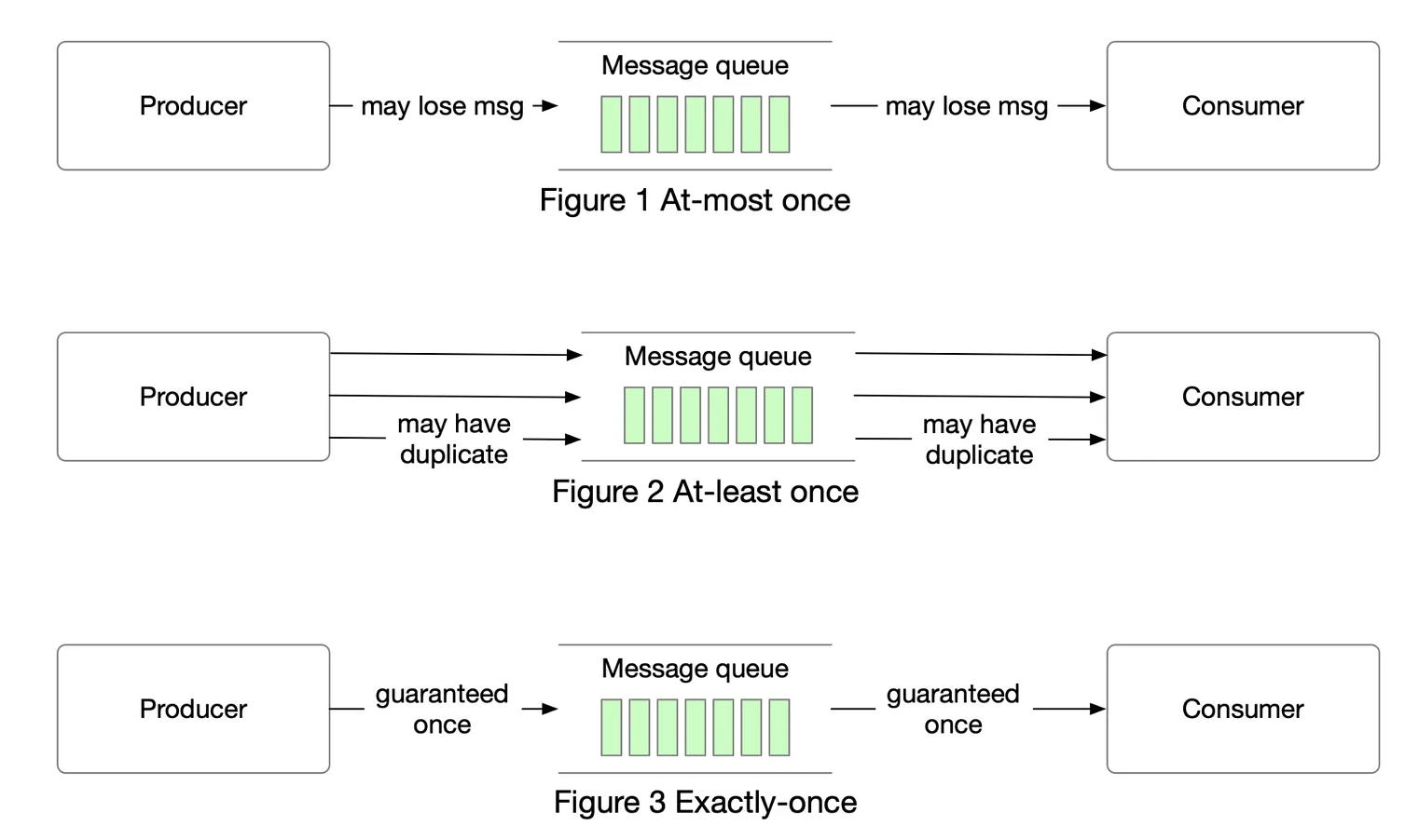 As the name suggests, at-most once means a message will be delivered not more than once. Messages may be lost but are not redelivered. This is how at-most once delivery works at the high level.