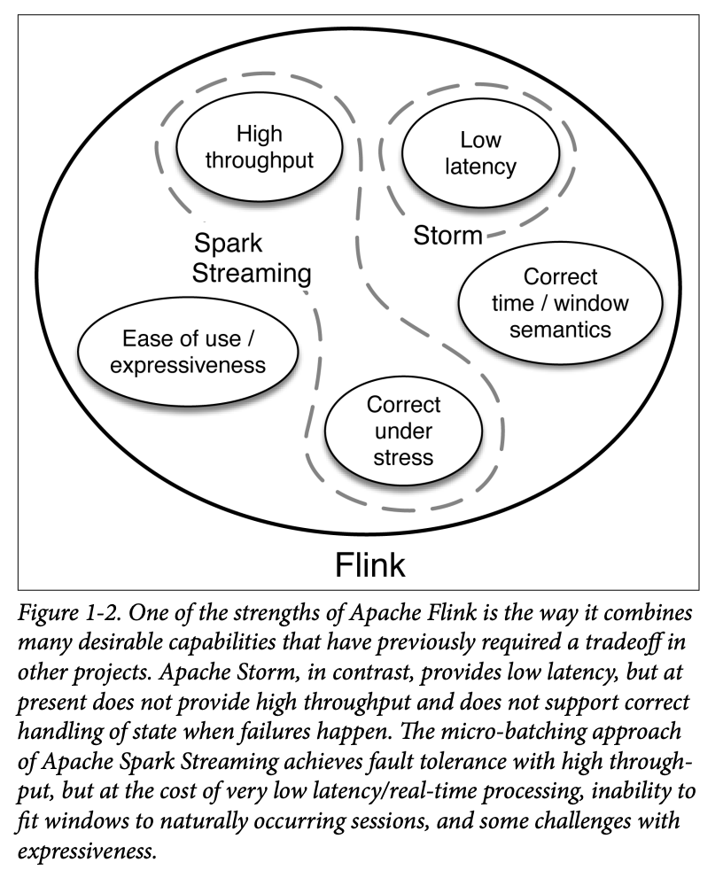 This brings us to Apache Flink, a data processor that removes many of these tradeoffs and combines many of the desired traits needed to efficiently process data from continuous events. The combination of some of Flinkâs capabilities is illustrated in Figure 1-2.