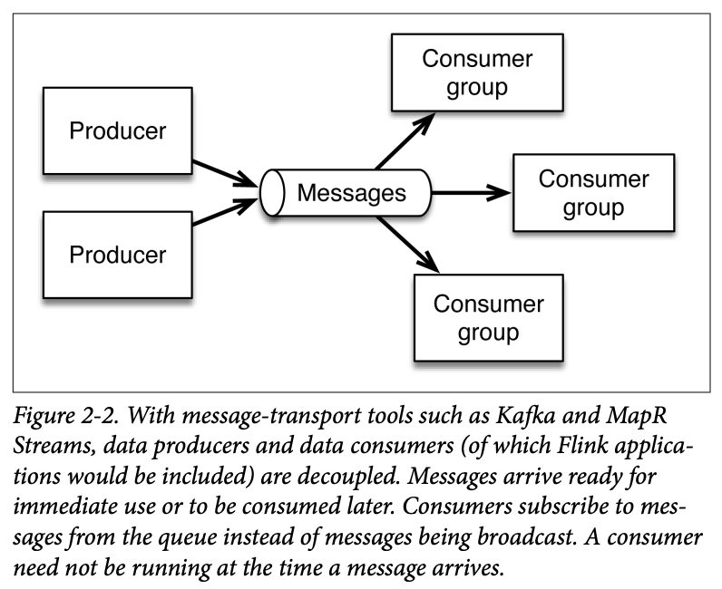 This style of deliveryâwith consumers subscribing to their topics of interestâmeans that messages arrive immediately, but they donât need to be processed immediately. Consumers donât need to be running when the messages arrive; they can make use of the data any time they like.