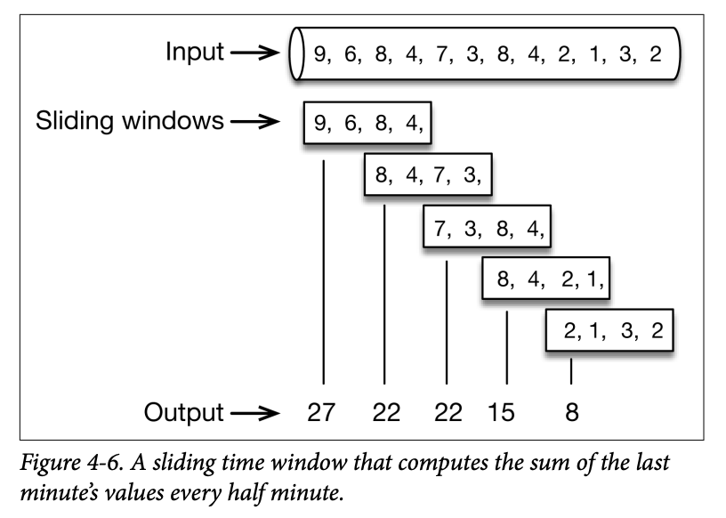 The simplest and most useful form of windows are those based on time. Time windows can be tumbling or sliding. For example, assume that we are counting the values emitted by a sensor and compare these choices.