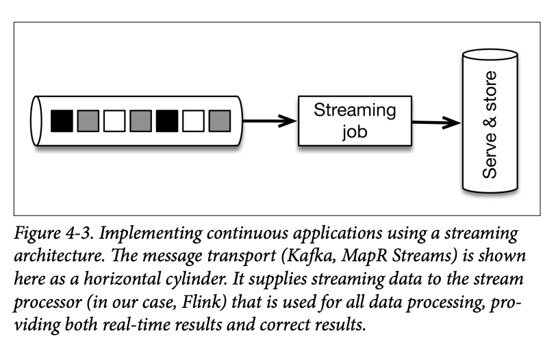 - Early alerts: Letâs say that we want to get early count alerts ASAP (when receiving, say, at least 10 events), in addition to counting every one hour. For that, we can use Storm to ingest the message stream (Kafka or MapR Streams) in addition to the periodic batch jobs. We just added yet another system to the mix, along with a new programming model. This is called the Lambda architecture, described briefly in Chapter 1 and shown here in Figure 4-2.