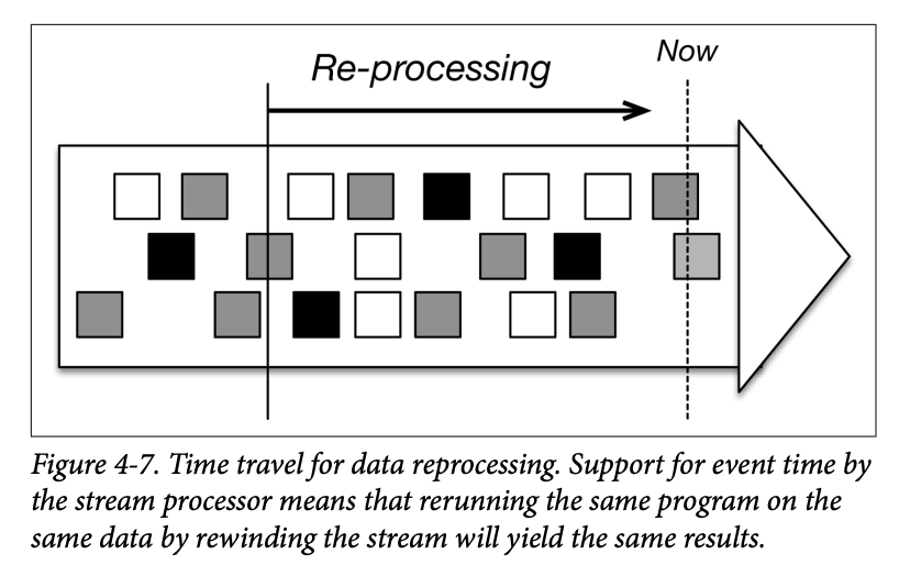 An aspect central to the streaming architecture is time travel. If all data processing is done by the stream processor, then how do we evolve applications, how do we process historical data, and how do we reprocess the data (say, for debugging or auditing purposes)?