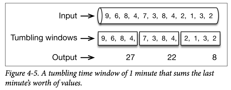 A tumbling window of 1 minute collects the values of the last minute, and emits their sum at the end of the minute, as shown in Figure 4-5.