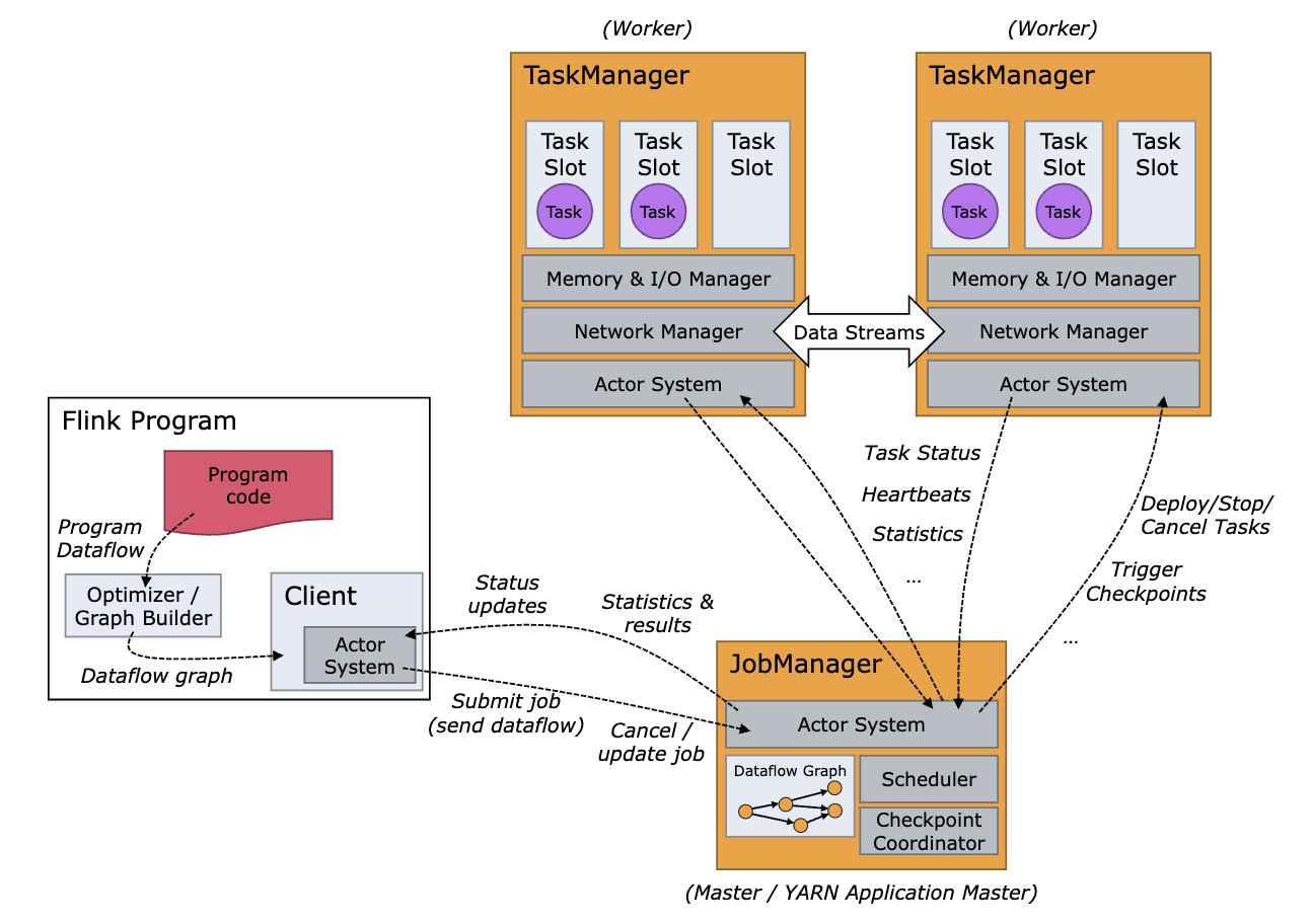 The TaskManagers (also called workers) execute the tasks of a dataflow, and buffer and exchange the data streams.