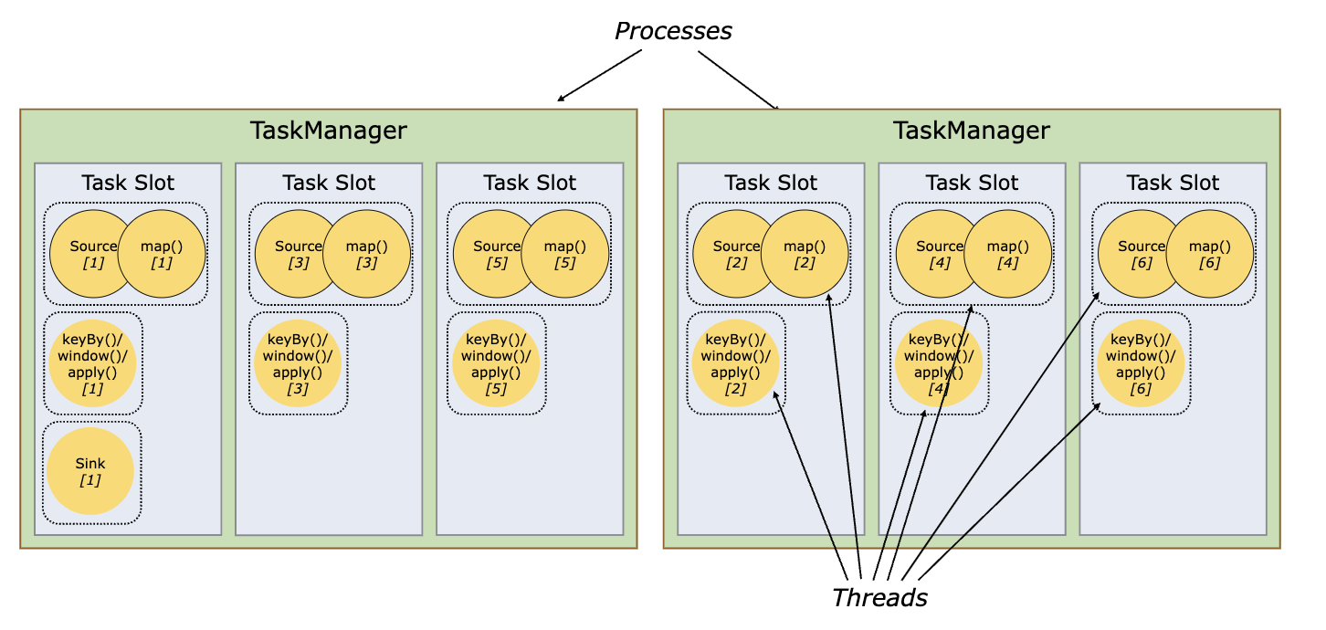source(),map()functions shown here are our “Operators”. Every operator will have some parallel instances running (referred as operator instance in this post) which is called parallelism of an Operator. In the above image,source()operator has 6 parallel instances running (source[1]….source[6]), distributed among all Task slots in both Task Managers, therefore it’s parallelism = 6 - A Task Slot is like a thread pool with multiple threads running inside it. If you see Task Slot 1 in Task Manager 1, there are 3 threads inside it. Each thread here is called a Task, it’s processing one parallel instance of a Operator or an Operator Chain (we will come to chain part later). {